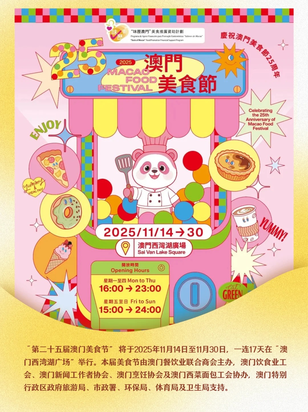 澳門 2025澳門美食節來啦‼️連開17天,140+特色攤位,從街頭小吃到環球美味全覆蓋,吃貨們沖啊! 銀富環球旅遊有限公司 12 11 月, 2025 35 次瀏覽 分享至: 澳門第72屆格蘭披治大賽車最新消息出爐🔥 年輕車手的夢想舞臺!近距離感受引擎的轟鳴! 優惠自由行套票立即預訂👉點擊此處 第二十五屆澳門美食節時間:2025年11月14日至11月30日星期一至四:16:00-23:00星期五至日:15:00-24:00地點:西灣湖廣場(觀光塔前) 包車直達前往👉點擊此處 平價機票點擊下方圖片立即預訂👇 從香港出發,乘坐金巴或者金剛飛航即可到達澳門今年大會設有三條穿梭巴士專線哦~方便大家在美食之間自由穿梭~ 預訂優惠船票點擊下方圖片👇 直達巴士上車地點: 1.黑沙環市場街(祐漢街市對面) 2.氹仔成都街 3.關閘廣場(入境處左側) 自行前往路線:拱北口岸-西灣湖廣場乘坐18或18B巴士(口岸步行到永定街站上車,澳門旅遊塔下車)橫琴澳方口岸-西灣湖廣場乘坐25B巴士(口岸-花城公園站下車)步行350米到澳門運動場站轉26號巴士,澳門旅遊塔下車大三巴牌坊-西灣湖廣場乘坐18/18B/9A巴士(從牌坊步行到水坑尾,公共行政大樓站上車,澳門旅遊塔下車,步行200米到達目的地) 🌟設有六個特色區域 ▲珍饈美饌的『中式美食街』 ▲異國風情的『歐陸美食街』 ▲秀色可餐的『甜品街』 ▲ 其味無窮的『風味美食街』 ▲ 風摩各地的『日韓美食街』 ▲ 饕餮大餐的『亞洲美食街』 總共有超過140個美食商號~~吃貨們趕緊來~~不要錯過啦~~ (圖片來源澳門特別行政區政府旅遊局和小紅書@澳門美食節) 更多優惠套票點擊下方圖片立即預訂👇